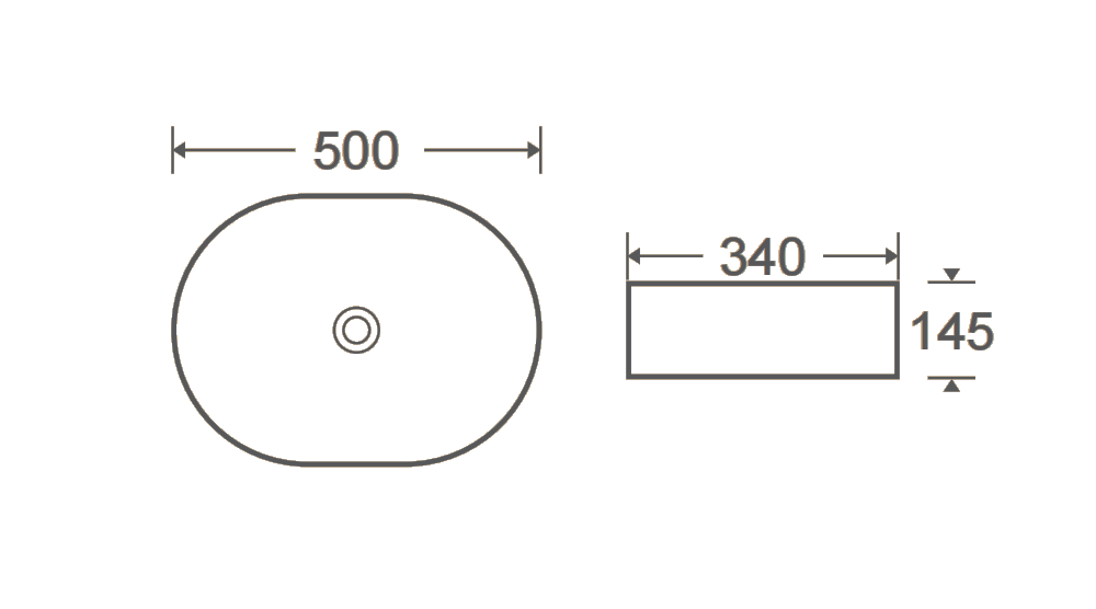 A sleek oval vessel basin featuring a textured white exterior and a smooth black interior for strong visual contrast. Designed with a central drain and clean, modern lines, it measures 500 mm wide, 340 mm front‑to‑back, and 145 mm high. Its contemporary two‑tone finish makes it a striking centrepiece for stylish bathroom spaces.