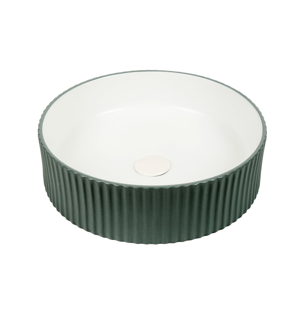 A modern round ceramic basin featuring a smooth white interior and a deep green ribbed exterior that adds texture and visual depth. Its minimalist form suits contemporary bathrooms, while the two‑tone finish creates a striking focal point. Durable, easy to clean, and designed to elevate vanities with a blend of elegance and character.
