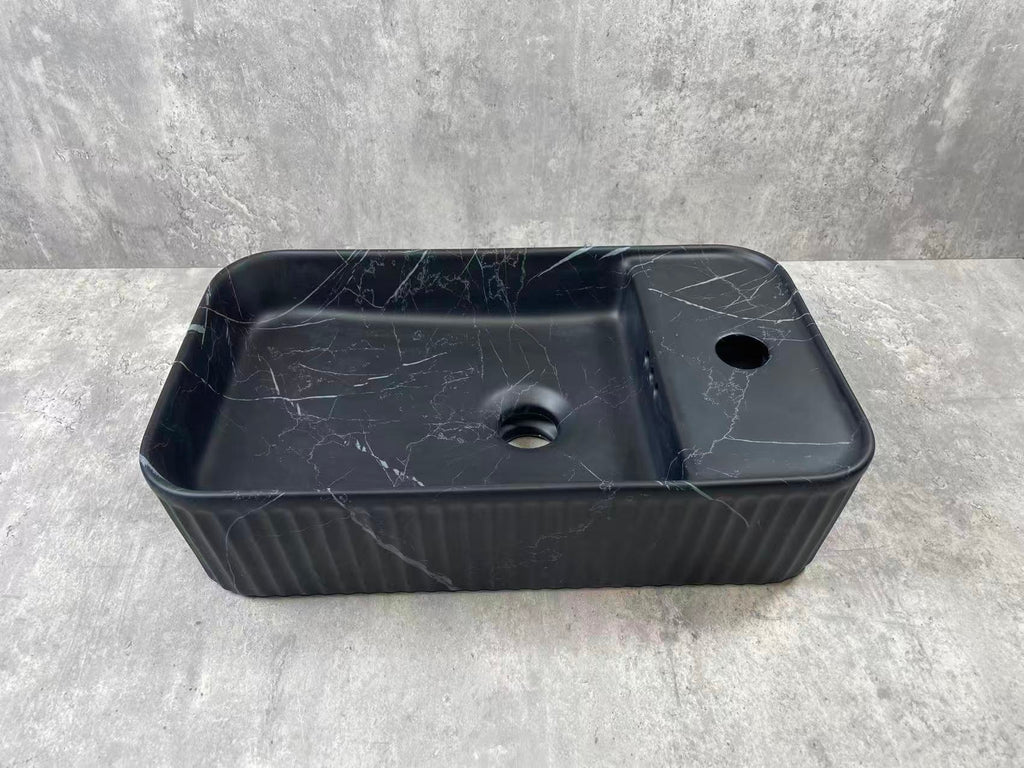 A sleek rectangular ceramic basin featuring a matte black finish with subtle veining and textured vertical grooves. Designed with a central waste hole and side tap hole, it offers a modern, durable, and stylish addition to any contemporary bathroom.
