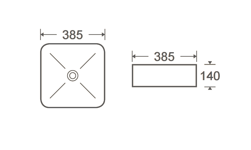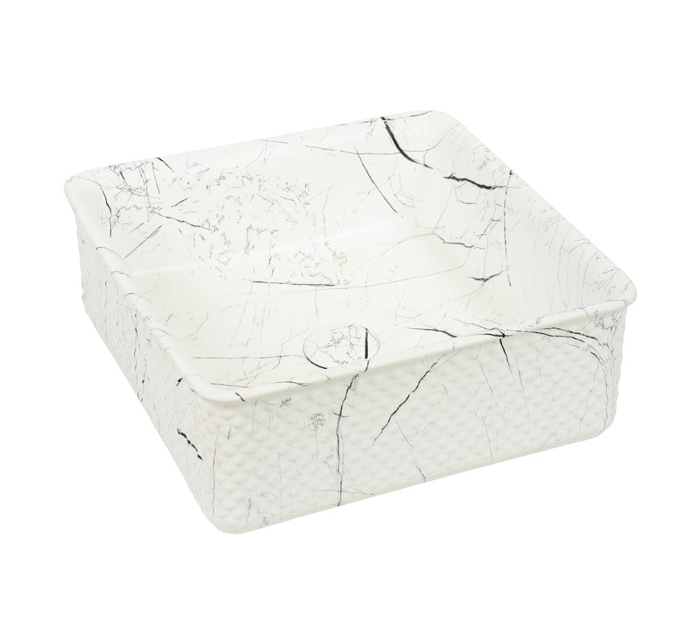 A contemporary square vessel basin crafted with a smooth interior and a textured exterior that adds depth and character. Its marbled white finish with subtle dark veining creates a refined, modern aesthetic suited to premium bathroom spaces. Designed at 385 mm wide and 140 mm high, the basin offers a balanced presence on any vanity, combining durability, elegance, and everyday practicality. The central circular drain enhances its clean, minimalist look while supporting efficient water flow.
