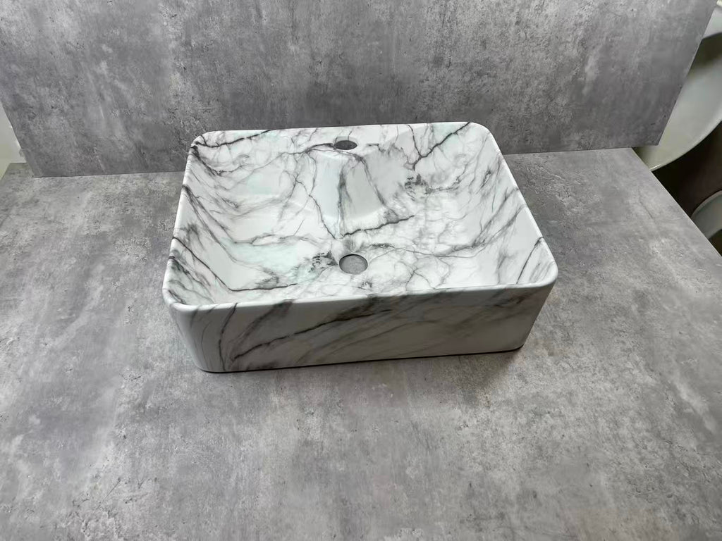 This modern rectangular bathroom sink features a sleek marble‑patterned finish with elegant white and grey veining. Designed with smooth rounded edges and dual pre‑cut holes, it offers both style and practicality. Its contemporary look enhances any bathroom space, delivering a premium, durable, and sophisticated countertop statement piece.