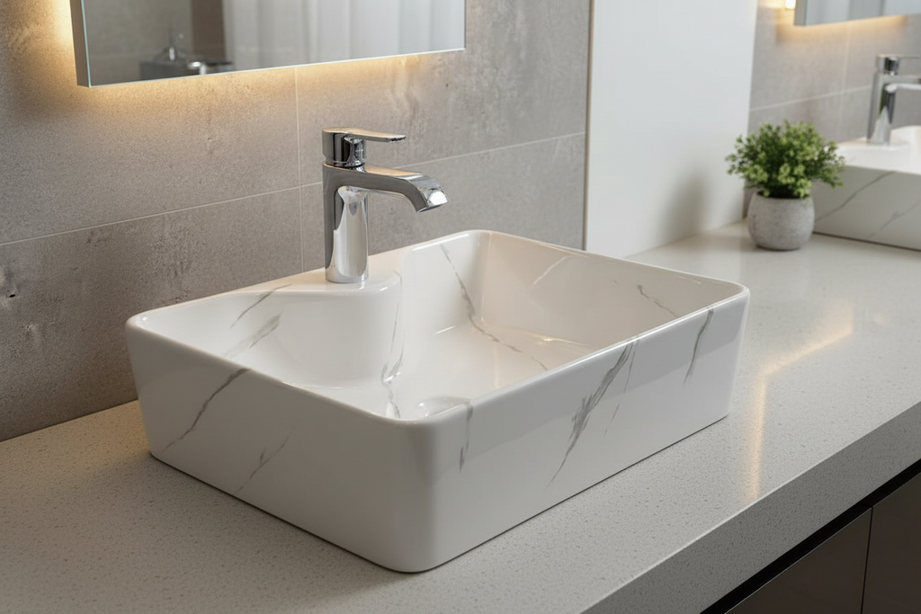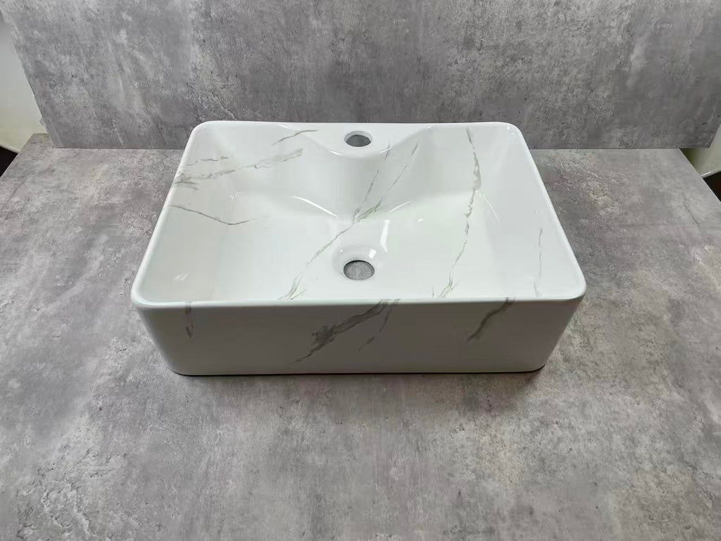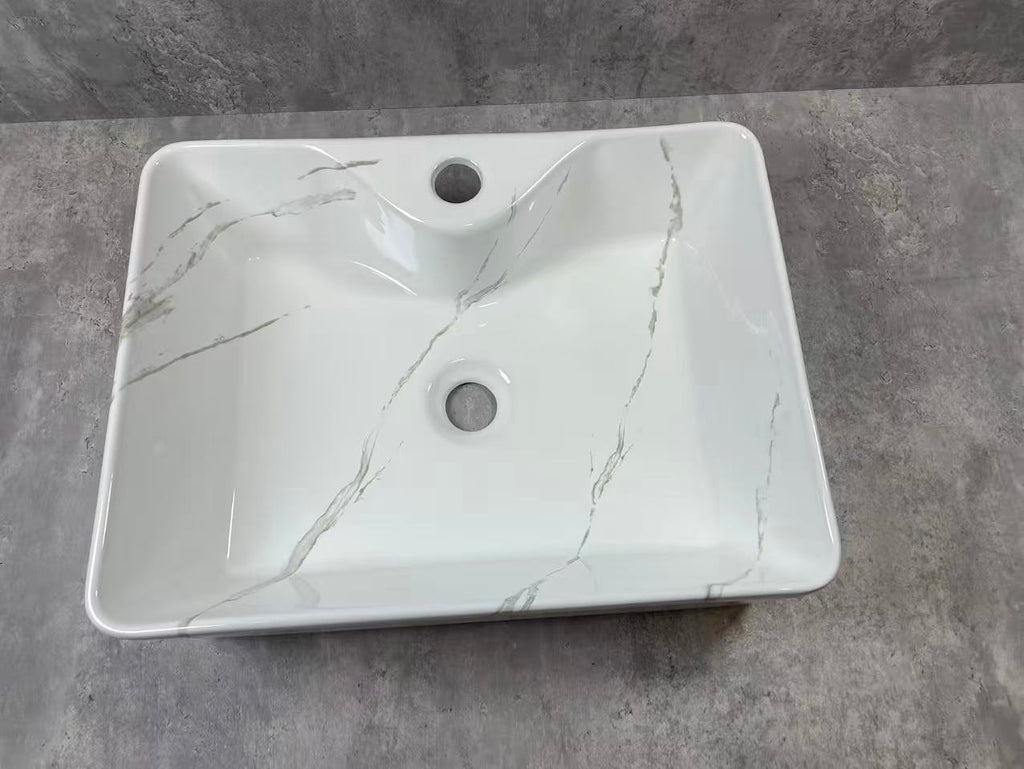 This elegant ceramic basin features a marble‑style finish with soft grey veining, creating a refined, modern look. Its smooth rectangular design includes a central drain and overflow for practical everyday use. Durable, easy to clean, and visually striking, it enhances any contemporary bathroom with understated luxury and timeless appeal.